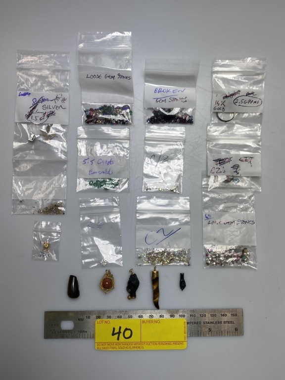 LOT 40- LARGE LOT CONSISTING OF ASSORTED MIXED GEMSTONES (SOME BROKEN STONES), CUBIC ZIRCONIA, EMERALDS (5.5 CARATS TOTAL WEIGHT ON EMERALDS), MISCELLANEOUS JEWELRY PIECES (THIS IS AN ASSORTED MIXED LOT)