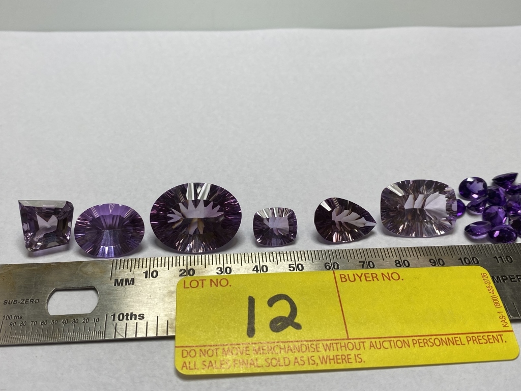 LOT 12- LOT CONSISTING OF LOOSE AMETHYST ASSORTED SIZES: (6) LIGHT PURPLE LARGE STONES AND (23) DARKER, SMALLER STONES, 130.40 CARATS TOTAL WEIGHT