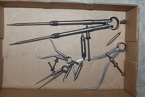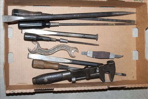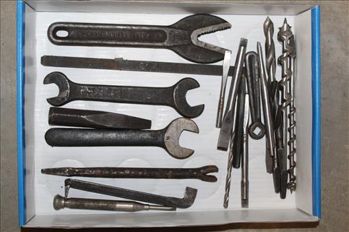 Tools: Broad Axe Head, 2 Man Saw, Jumper Cables, Hand Drill, Wood Vise, Small Cast Pulley Wheel, Wood Plane, Vintage Hand Tools, Machinist Tools, & ETC..