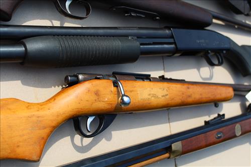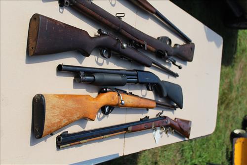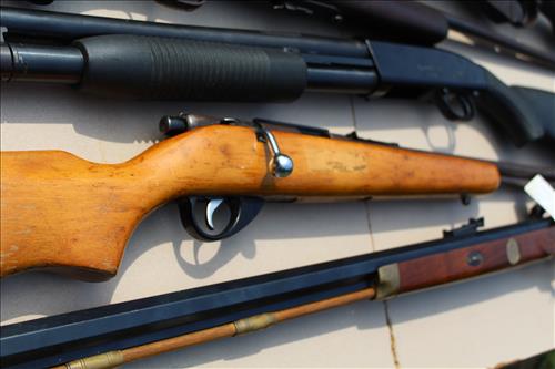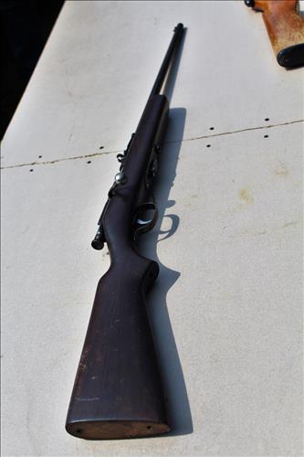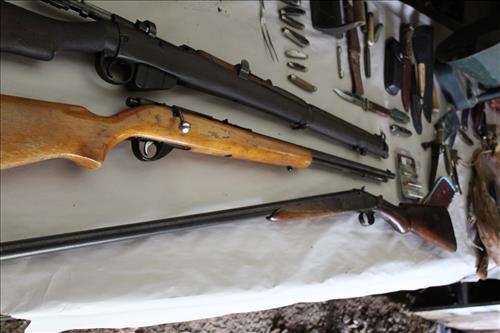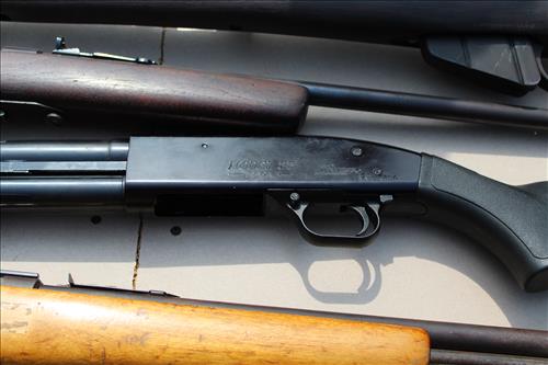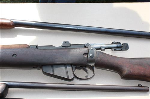 Guns: British Full Stock 303 Cal, Army Gun Co 12 Ga, Stevens Model 55 22 Cal, Maverick Model 88 12 Ga, J C Higgins 22 Cal & Thompson Center Arms Flint Lock w/Hand Carved Spider Motif.