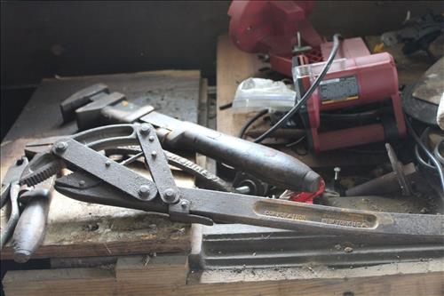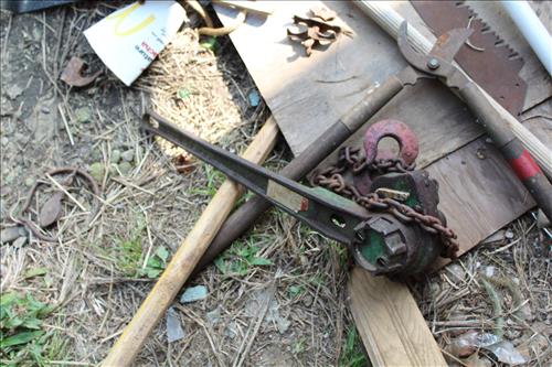 Tools & Tractor: Ford 2000 Tractor w/Front End Loader & Wheel Weights - Runs Well,Cast Iron Work Bench, Lg & Small Anvils, Anvil Base Stand, Chain Hoist, Come-A-Longs, Welding Gauges, Ideal Arc Lincoln Arc Welder, Pellet Jack (needs work), Hitch Bracket, 2 Wheels & Tongue, Large Quantity of Handles, Sledge Hammers, Wedges, Picks, Lg # of Single/Double Axes, and more..