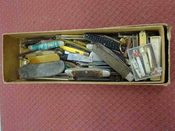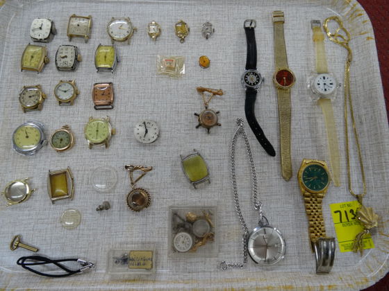 Many vintage clocks, old wristwatches, numerous antique pocket watches, watch chains, fine and costume jewelry, old pocket and pen knives.