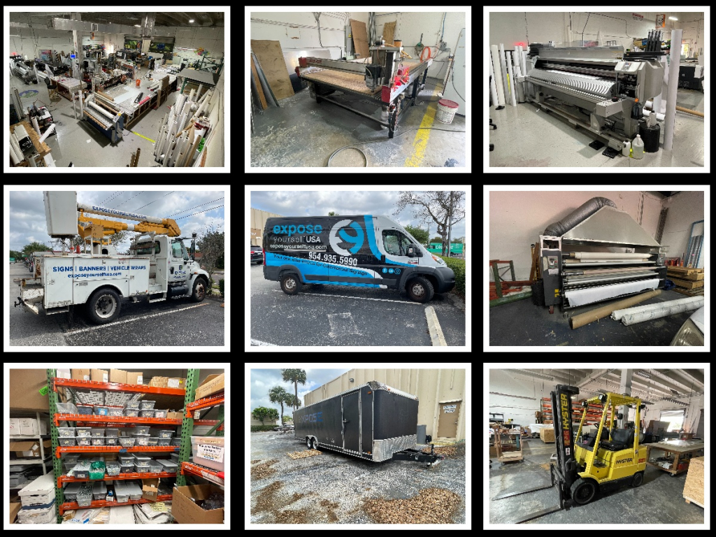 Sale will consist of: Sign and Prop manufacturing equipment, CNC printing and cutting machines, 4D foam cutting system, vehicle wrap machinery, huge CNC printing machines for large billboard size banners, sewing and fabrication equipment, paint booth and supplies, paint mixing system, vast amount of inventory and hardware, foam wire cutting machinery, CNC routing equipment, raw materials, aluminum, warehouse house equipment, power tools, dust collector, compressors, tandem axle enclosed trailer, pallet racking, office furniture, office equipment, TV’s, vehicles: Ram 2500 ProMaster, International 4300 bucket truck, 2004 Nissan Titan LE King Cab 2WD Pick-up and much more.