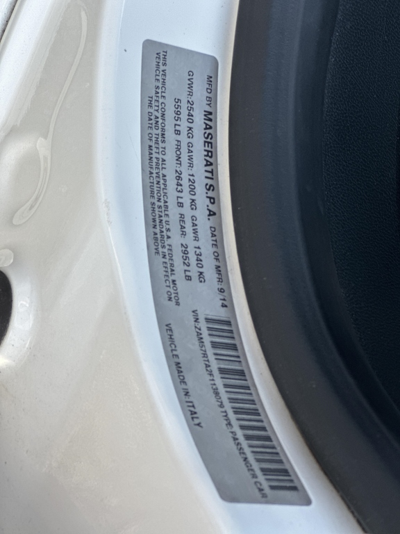 Sale will consist of a wide range of 2015 Maserati Ghibli 3.0L V6 engine, VIN: ZAM57RTA2F1138079, Odometer reading: 69,679 (starts and runs)