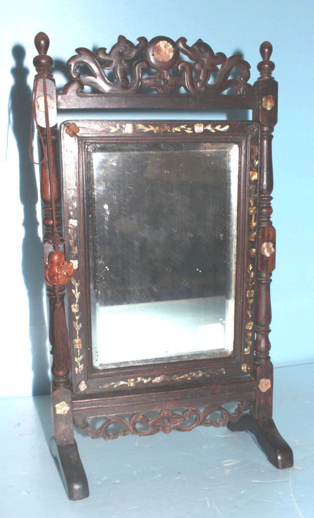 19th century rosewood with mother of pearl small table mirror having foo dogs carved as a crest; 10" w., 18" h.