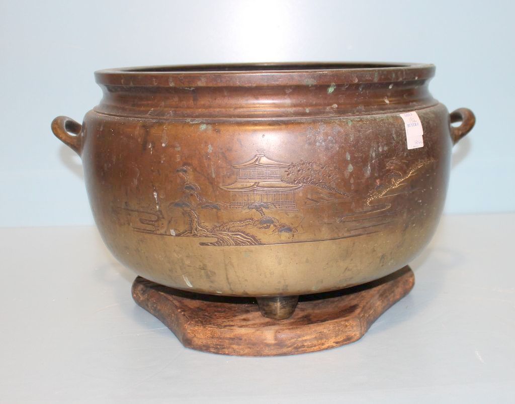 Nineteenth century Large Chinese bronze jardiniere which has various landscape chasing going around the exterior, sits on wood base; 20 1/2" w., 12" h.