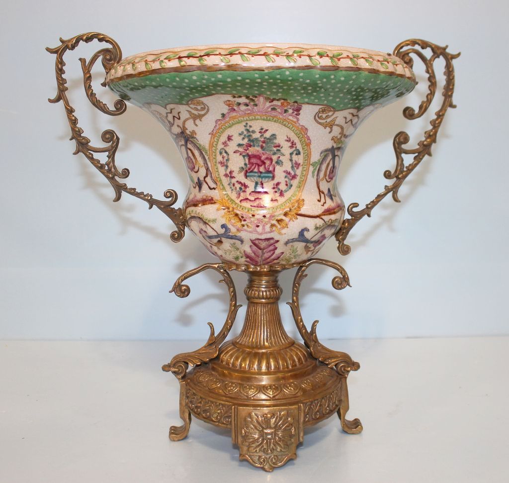 Large hand painted bronze Ormalu and hand painted fine crackle porcelain. (centerpiece) ; 14 1/2" w., 15" h.