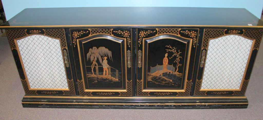 20th century black lacquer oriental console. Cabinet has two doors in the center with hand painted oriental man and lady. Each side door of these have metal latticework and fabric; 76" w., 18" d., 29 1/2" h.