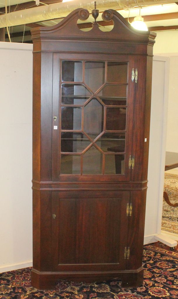 Corner Cabinet with divided glass door on top, solid single door on bottom, 37"w., 14"d., 88"h.