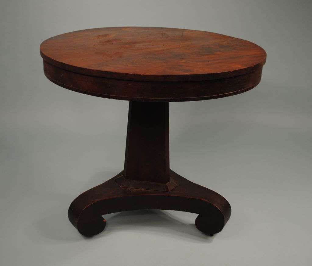 Four sided pedestal, scroll feet, and round top. 31.5"h, 35"d.
