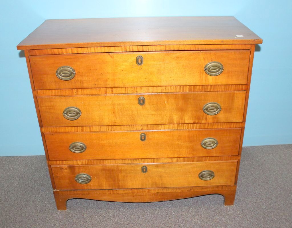 Early 1800's cherry American chest. Four drawer cherry chest that has great visible dovetails and hepplewhite hardware; 38" w., 18" d., 34 1/2" h.