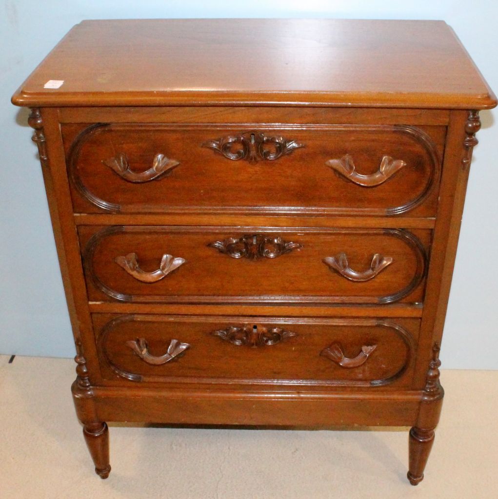19th Century walnut Victorian three drawer chest on turned legs, carved wood pulls. 30 1/2" w., 18" d., 38" h.