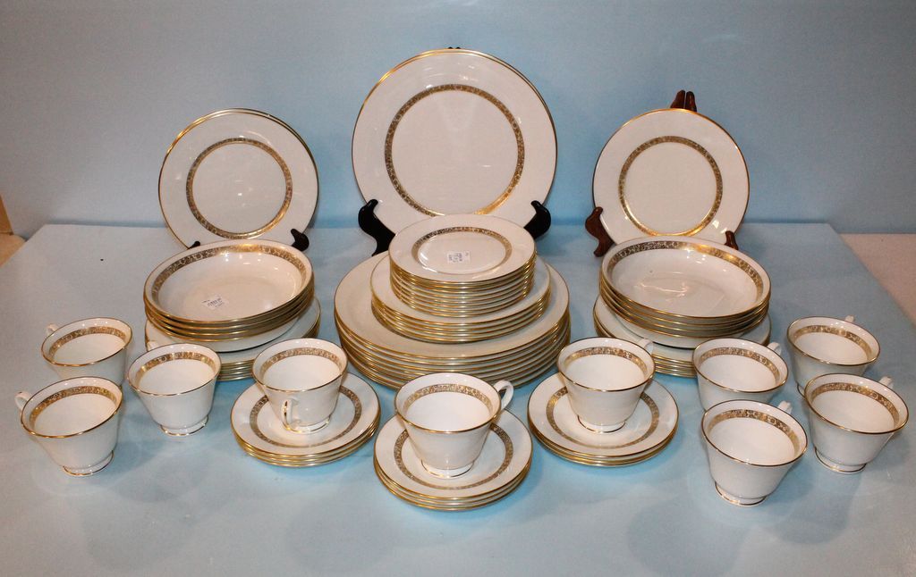 Set of Oxford (division of Lenox) "Golden Glen" china consisting of ten dinner plates, sixteen salad plates, eight soup bowls, eight bread/ butter, ten coffee cups, nine saucers; sixty-one total pieces