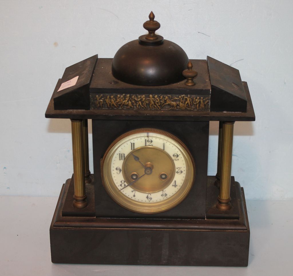 20th Century or Late 19th Century French Slate Mantle Clock Marked Fabrique de Paris, missing finial, needs restoration; 10" w., 13" h.