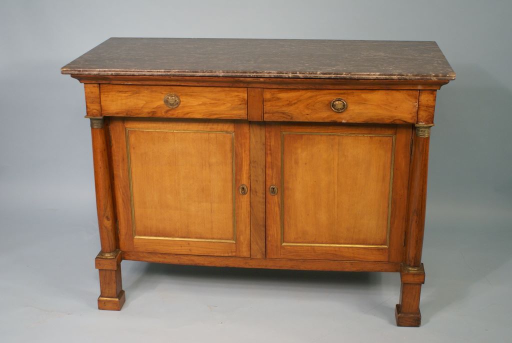 Louise Philippe gilt bronze mounted mahogany commode. 19th Century rectangular grey marble, frieze drawer on collonettes, two drawers over two doors. 47 1/2"w x 22"d x 35"h