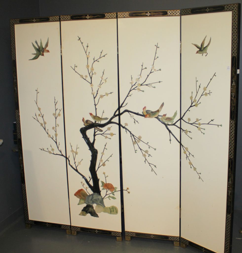 Four section oriental Screen with carved faux mother of pearl birds, 18"w., 72"h.