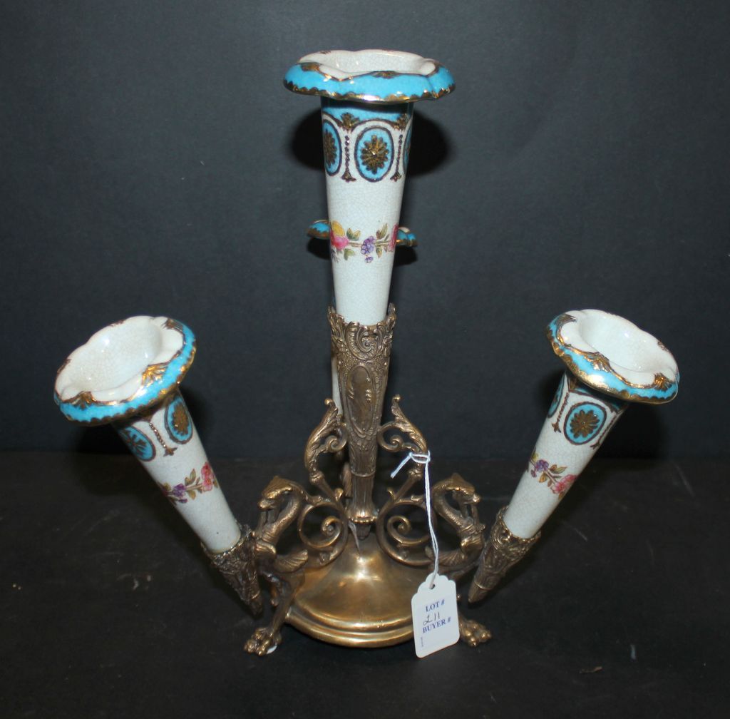 Bronze paw foot, griffin head epergne with three porcelain inserts. 11 1/4" h., 10 1/2" dia.
