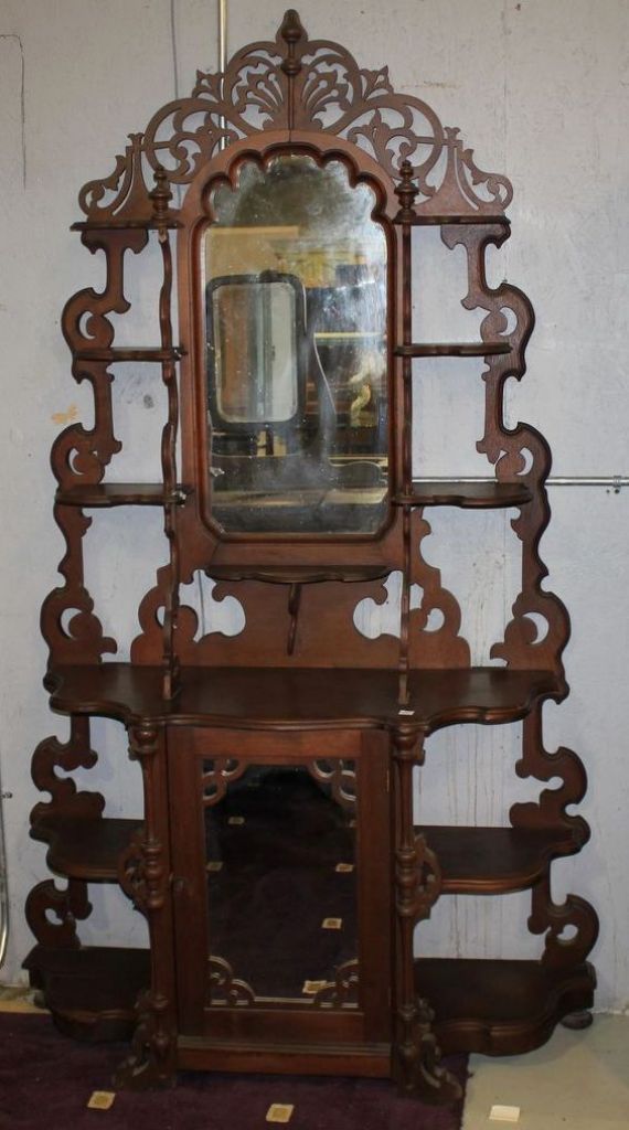 Victorian "As Is" Etagere. Mid 19th Century walnut with center glass door flanked by two shelves. 41"w, 19"d, 42"h.