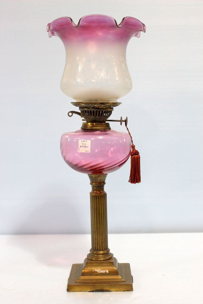 Victorian brass oil lamp with cranberry font. Beautiful oil lamp with ruffled cranberry shade. 22 1/2" h.