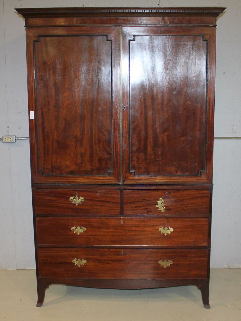 Mahogany linen press with two doors, four drawers supported by splay feet, 48"w., 24"d., 80"h