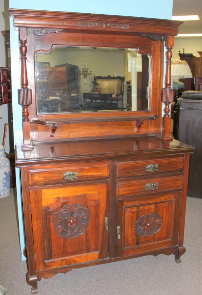 Late nineteenth century mahogany English server. Two section server in which the top has beveled mirror and tagre' style. The bottom section has three drawers and two curved paneled doors; 47" w., 17" d., 75" h.
