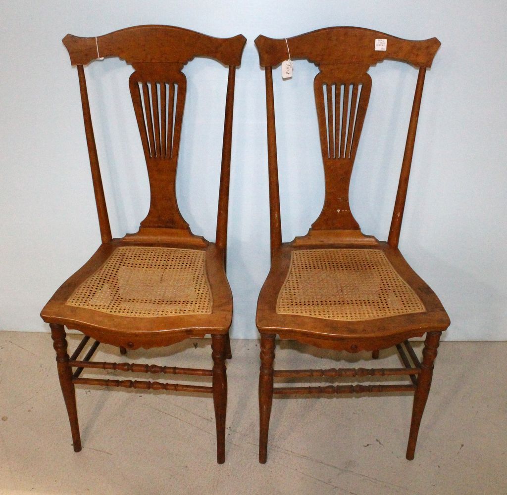 Pair birds eye maple side chairs with cane seats; 16" w., 13" d., 32 1/2" h.