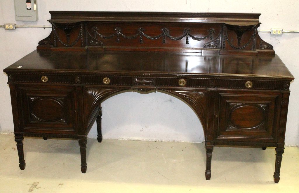 Early 20th century mahogany Edwardian sideboard that has open center section, three drawers, and two doors. The back splash has shelves and ornate swags; 89" w., 30" d., 52" h. Comes apart into 6 pieces.