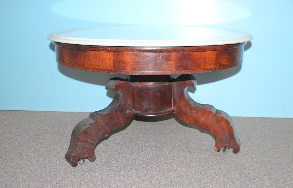 Empire period mahogany marble top table which has been reduced in size in order to be used as a coffee table; 32" dia., 20" h.