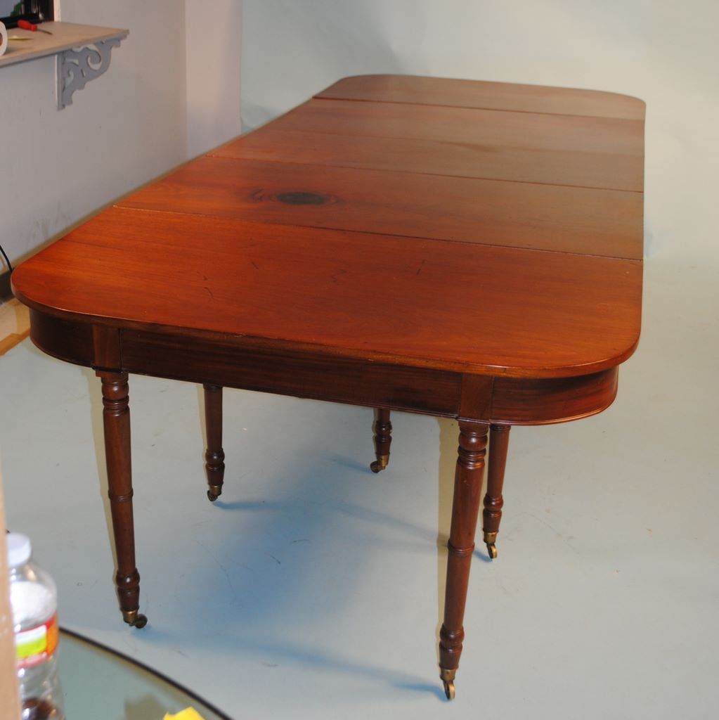 Early 19th Century Three Part Mahogany Dining Table. Center Section has two drop leaves and demi-lune (console) ends. Turned legs with period caps and castors. Table 19"w 10'L 28"h. Consoles can be added to Center Section to convert into Banquet Table.