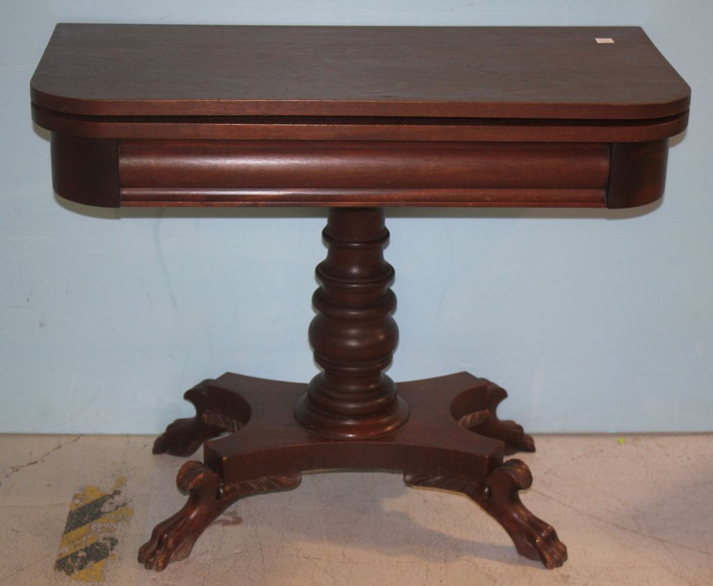 Mahogany Empire Revival Card Table with Carved Paw Feet; open top is; 36" square, 36" w., 18" d., 28 1/2" h.