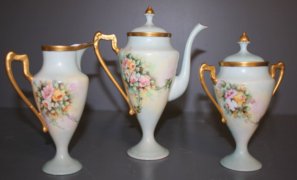 Three piece hand painted porcelain tea set consisting of teapot, creamer, sugar 7"h.