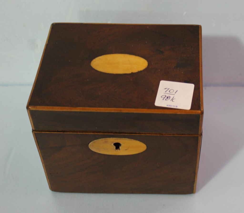 Antique Mahogany Tea Caddy with Inlay; 5" w., 3 7/8", 4 1/2" h.