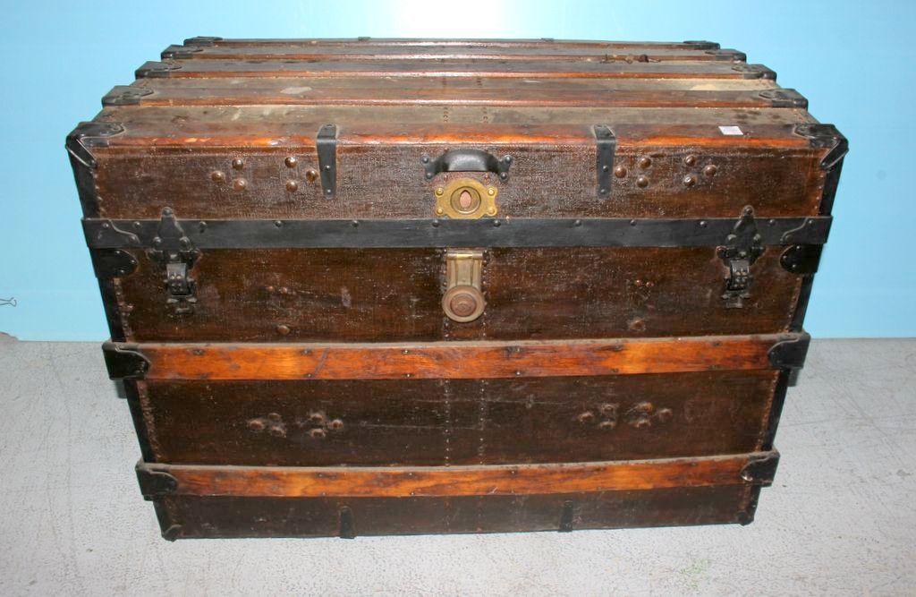 Large late nineteenth century steamer trunk. Steamer trunk with oak and canvas alternating strips and metal straps. 39" w., 24" d., 27" h.