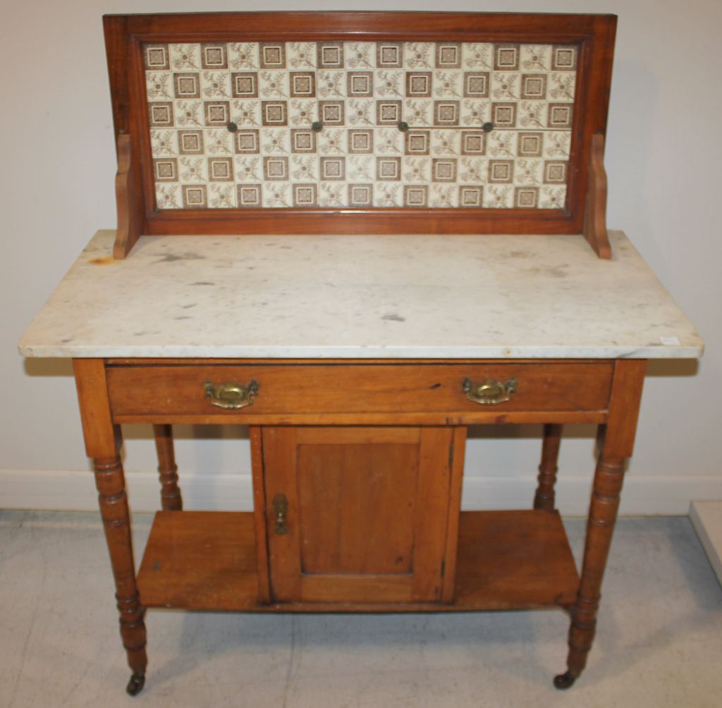 Marble top, tileback English washstand with door and drawer, chips on marble; 39 1/2" w., 19 1/2" d., 45" h.