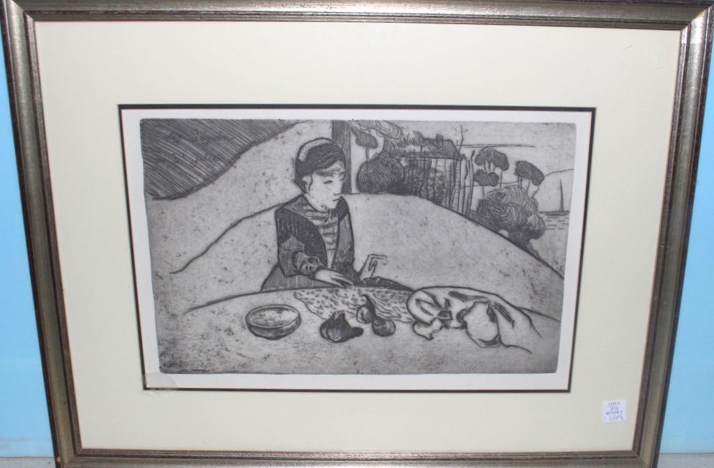 Original etching titled "La Marchade de Figures" by Paul Gauguin (French 1848-1903). Gauguin is closely linked to empressionism. This etching is signed and has certificate of authenticity number 21381; 26" w., 20" h.