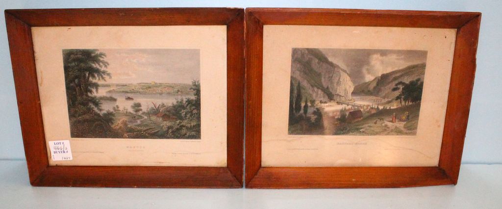 "Harpers Ferry" by Herman Meyer. Colored lithograph done in 1850. "Mauvco Mississippi." Both in original pine frames; 10 1/2" w., 8" h.