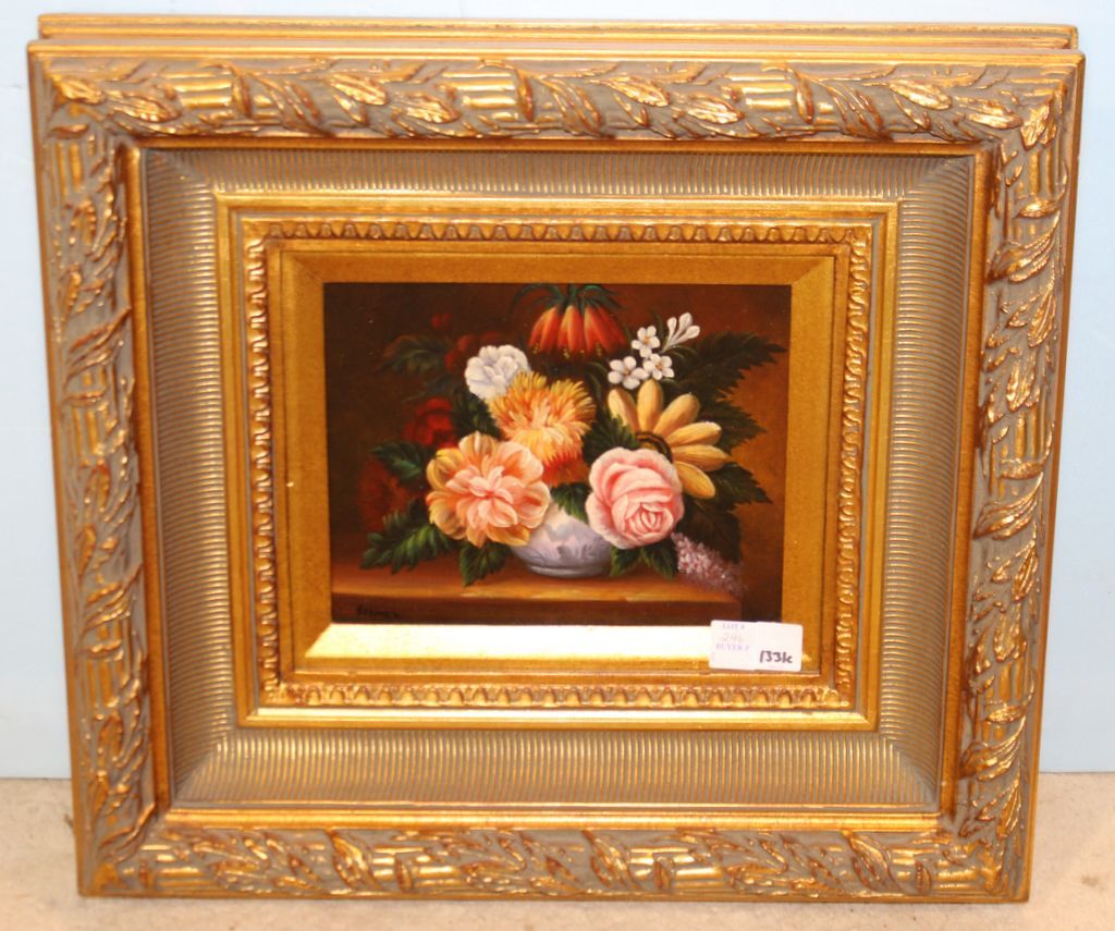 Oil painting on canvas of flowers signed Steinzy in left corner; 20 1/2" w., 19" h.