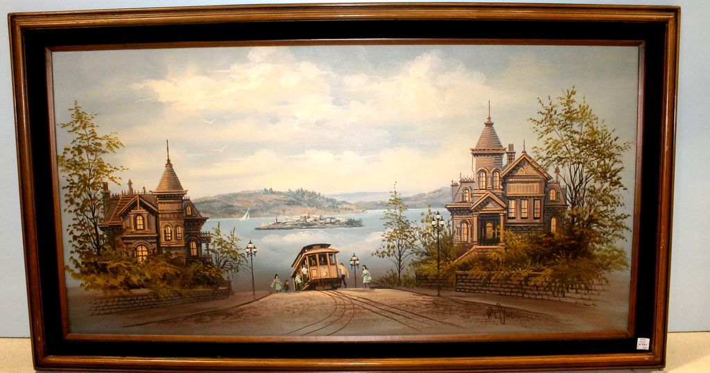 Oil painting depicting trolley car on San Francisco street with Victorian houses, and signed lower right W.M.E. Daniels (William E. Daniels, American 1908-1995) ; 54" w., 29" h.