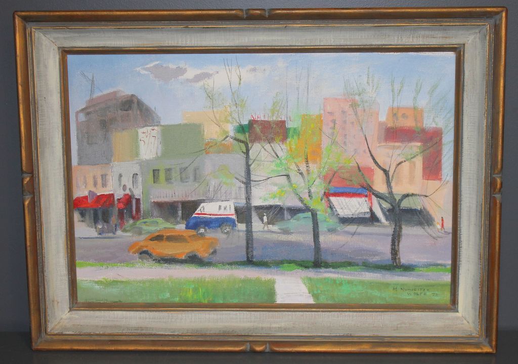 Oil on canvas of city street with cars, trees, buildings, and pedestrians, signed and dated M Nungester Wolfe '72; 29" w., 21" h.