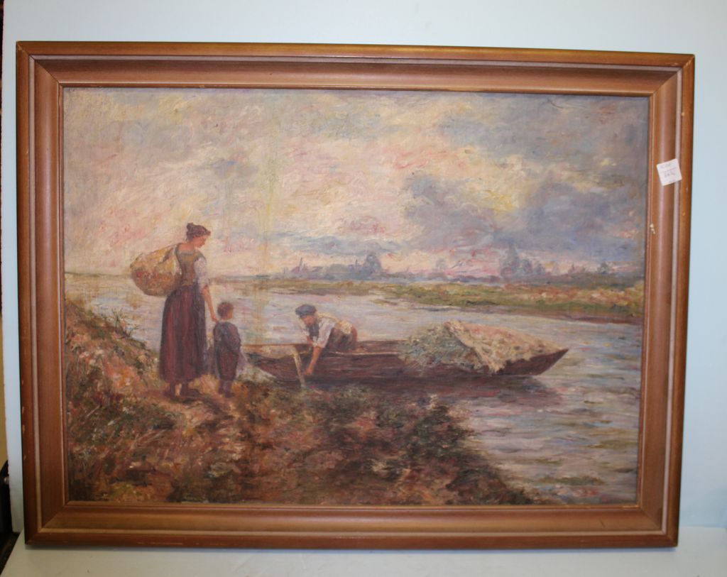 Textured Oil Painting of lady and child standing on water edge waiting for fisherman; 31":w., 23" h.