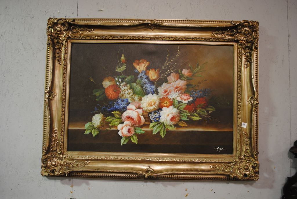 Large Floral Oil Painting signed C. Hope, in nice gold wood frame. 47"w x 35"h
