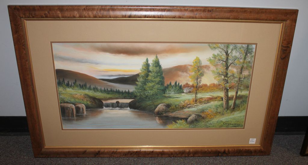 Landscape Watercolor of Cabin by Stream signed lower right Ginderson, 37"w., 23"h.