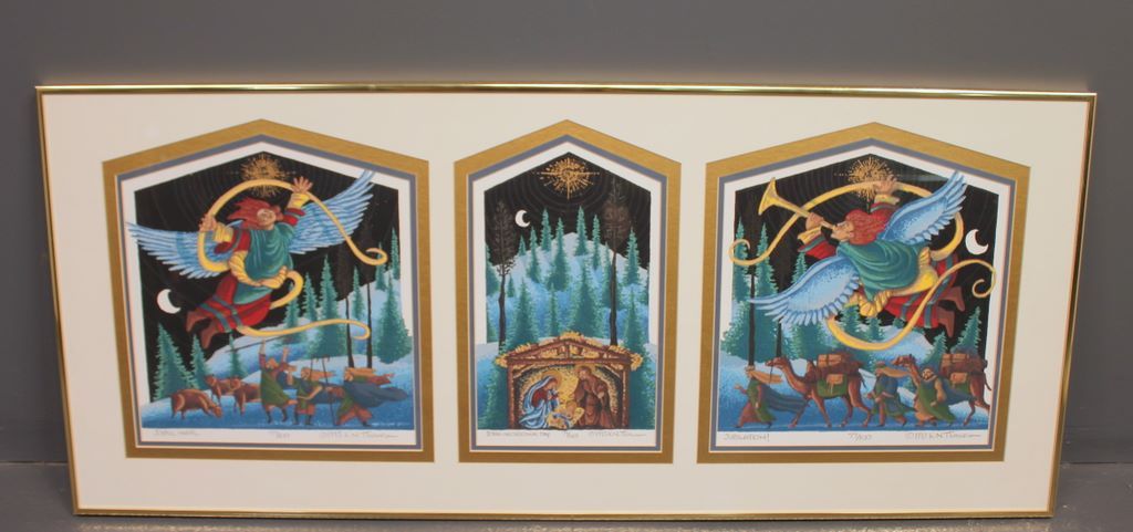 Watercolors of Biblical Scenes by K.N. Thomas, includes; Joyful Angel, Born on Christmas Day, Jubilation! 1993 77/100; frame 17" x 40"