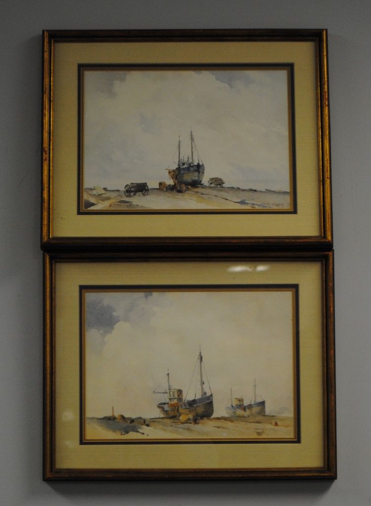 Pair Watercolors of Boats on Shore signed Francis S. Leke, 15 1/2"h 20"
