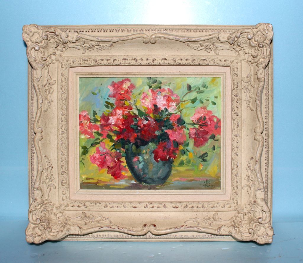 Floral painting in frame signed Yvette Sturgis. Yvette Sturgis was born in Panama and is a well known impressionist. She has shown at the Mississppi museum. 16" w., 14" h.