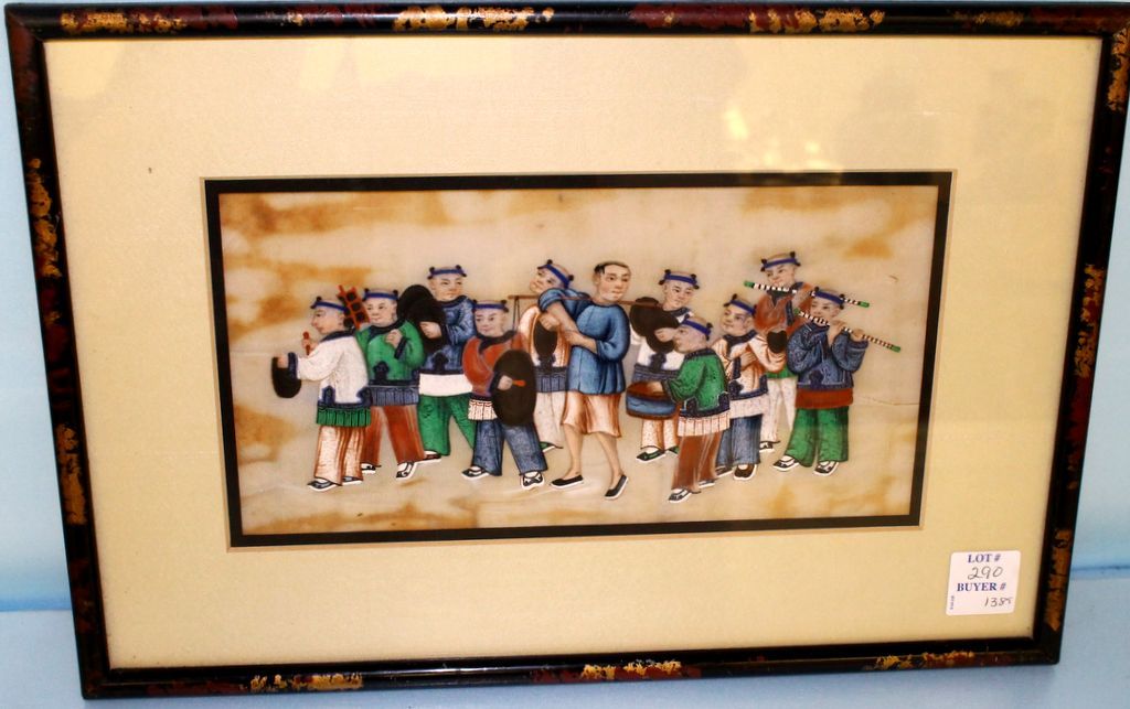 Framed painting of Chinese men playing the flute; 13 1/2" w., 9 1/4" h.