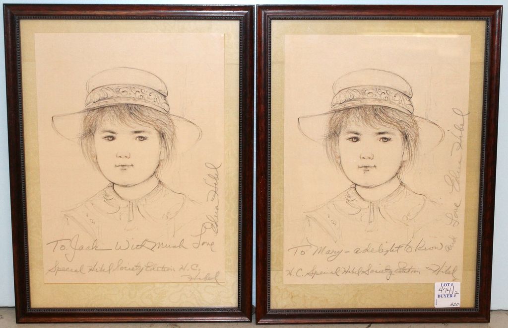 Two original pencil drawings of same young girl. Both special Hibel Society Editions. One to Mary and one to Frank; 9" w., 12" h.