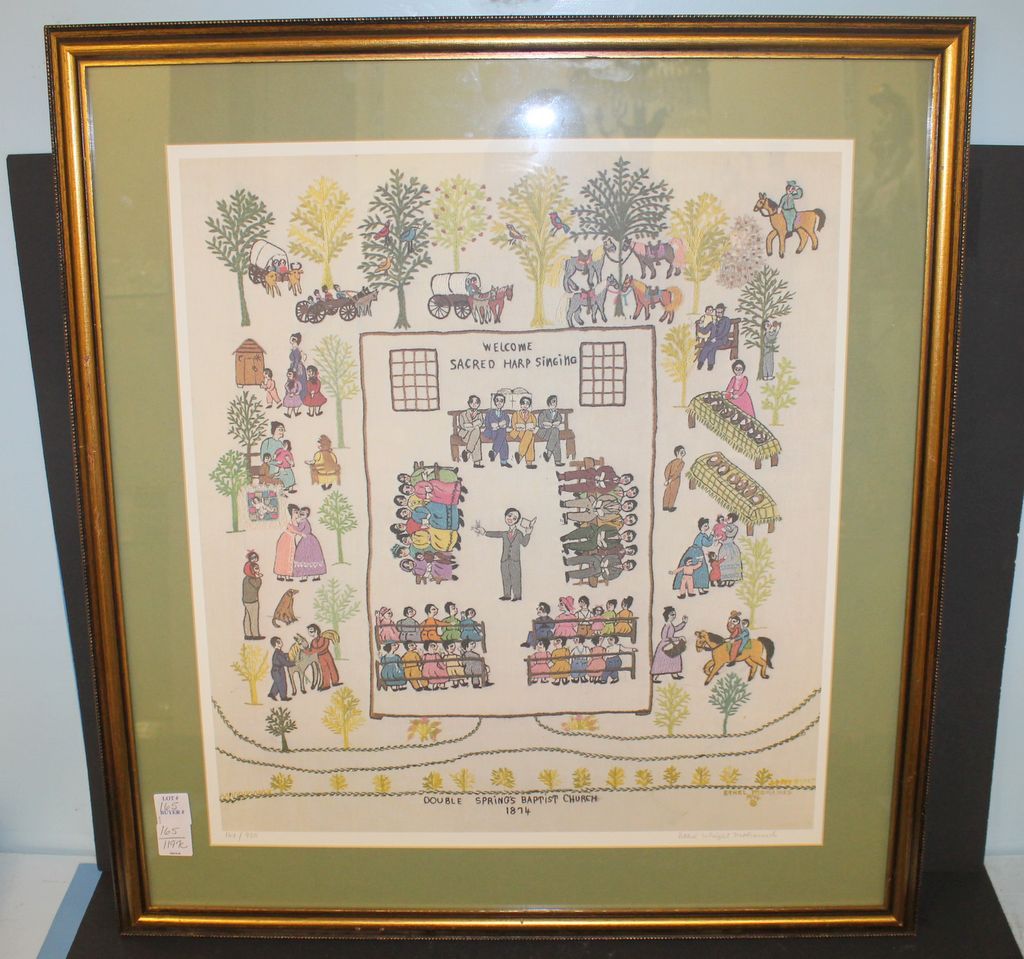 Stitchery depicting "Sacred Heart Singing" signed Ethel Wright Mohamed, numbered 164/950; 23 1/2" w., 25 1/2" h.