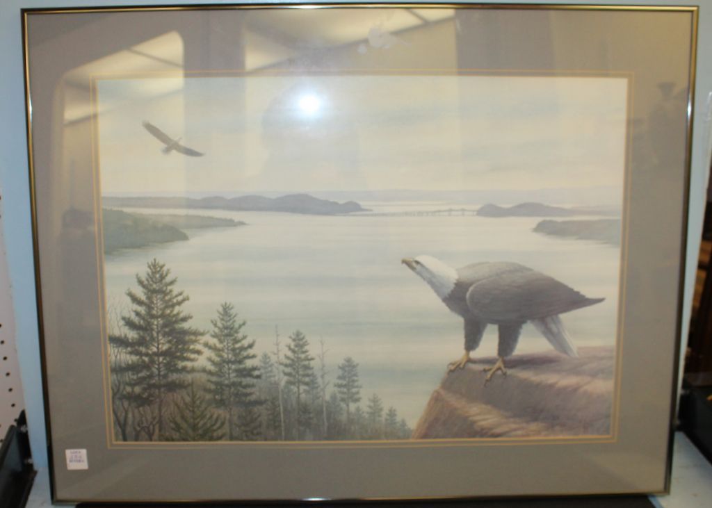 Limited edition 183/650 of eagles which he studied, overlooking Guntersville bridge. Signed and dated Gene Price '81. 30"w., 23"h.