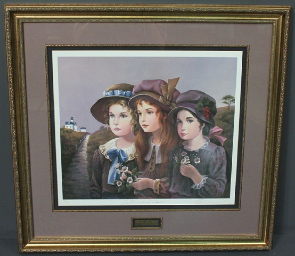 Limited Edition 59 of 950 "Buttons and Bows" by Pati Bannister, Mississippi Gulf Coast Artist. Three young girls dressed in purple, also having hats and flowers. Beautifully framed with purple matte. Signed lower right Bannister. 33" w., 30 1/2" h.
